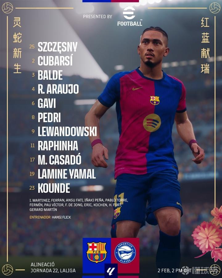 巴塞罗那的首发阵容是25号门将什琴斯尼,23号孔德,4号罗纳德-阿劳霍,2号库巴西,3号阿莱士-巴尔德,6号加维,8号佩德里,17号马克-卡萨多,11号拉菲尼亚,19号亚马尔,9号莱万多夫斯基。而阿拉维斯的首发阵容则包括了奥沃诺、泰纳利亚、圣地亚哥-莫里尼奥、穆萨-迪亚拉、马努-桑切斯,格瓦拉,安东尼奥-布兰科,卡洛斯-比森特,科内齐尼,古里迪,基克-加西亚。